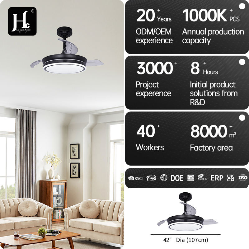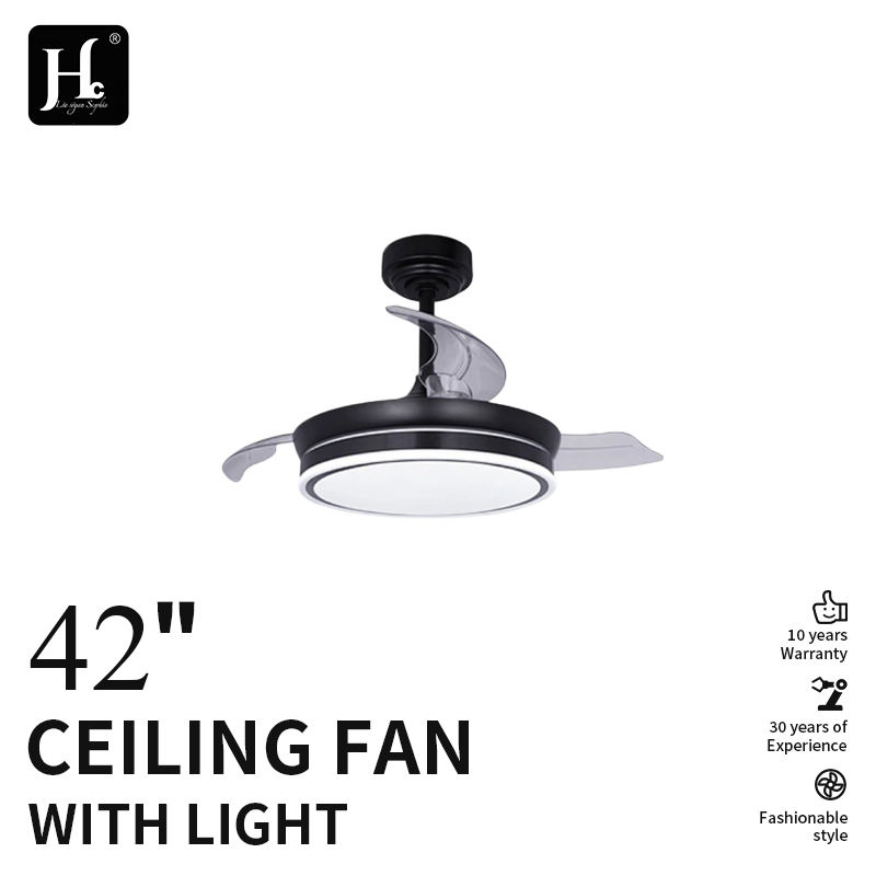 พัดลมเพดานติดโคมไฟ LED แบบซ่อนใบพัด 3 ใบ ขนาด 42 นิ้ว พร้อมรีโมทคอนโทรล สำหรับตกแต่งภายในห้องนอนสไตล์โมเดิร์น