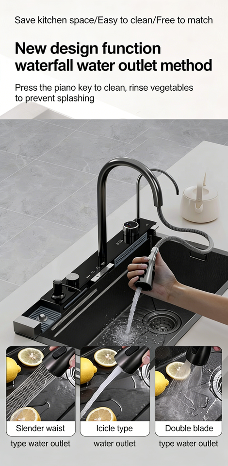 อ่างล้างจานครัวทันสมัยพร้อมจอแสดงผล LED ควบคุมแบบสัมผัส อ่างสแตนเลสพร้อมก๊อกน้ำแบบน้ำตกและหน้าจอแสดงเวลา