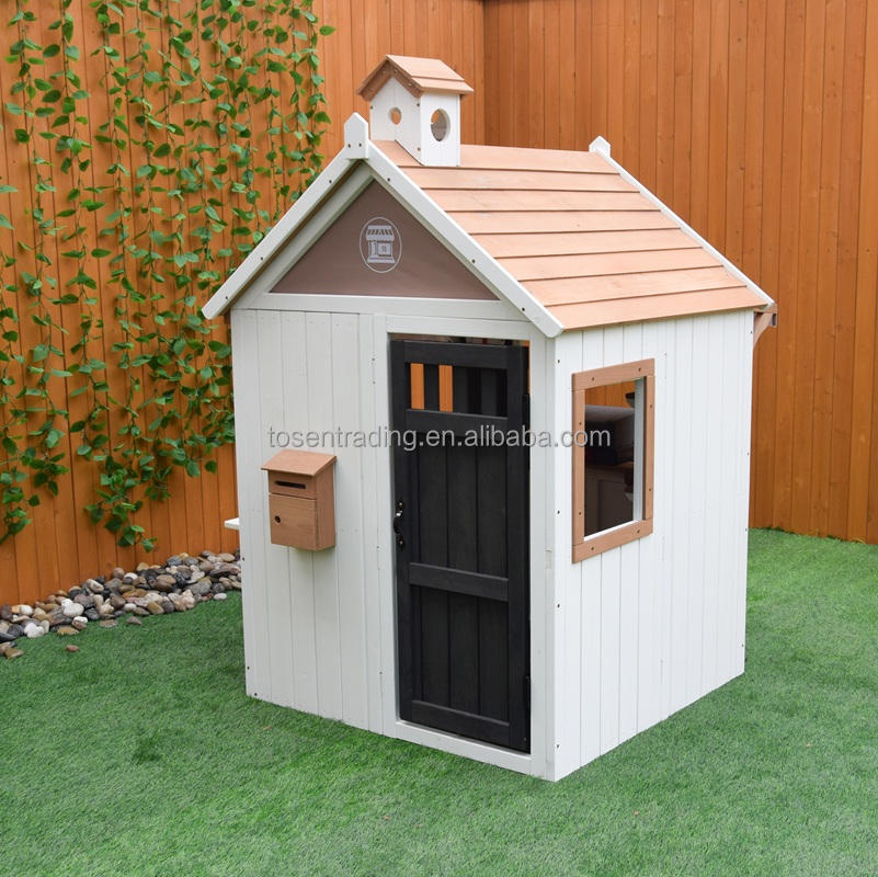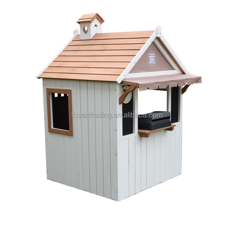 บ้านไม้สไตล์มินิสมัยใหม่สำหรับเด็กเล่นกลางแจ้ง พร้อมเคาน์เตอร์ ตู้ไปรษณีย์ และปล่องไฟน่ารักสำหรับเล่นในสวน