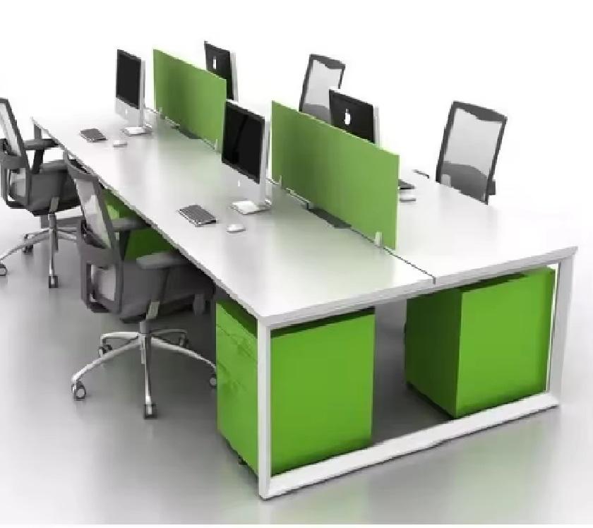 โต๊ะเวิร์กสเตชันแบบแยกส่วนที่ทันสมัยพร้อมพาร์ทิชันสีเขียวและลิ้นชักสำหรับพื้นที่สำนักงานที่ทำงานร่วมกันและการผลิตของทีม