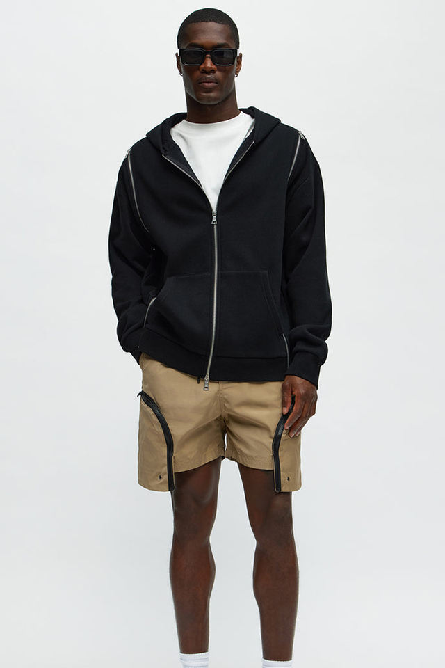 สตรีทแวร์ที่ทันสมัยได้รับแรงบันดาลใจจากกางเกงขาสั้นสีกากีพร้อมซิปสีดำแนวตั้งขนาดใหญ่วิ่งลงด้านหน้าจับคู่กับกางเกงขาสั้นสีดำ