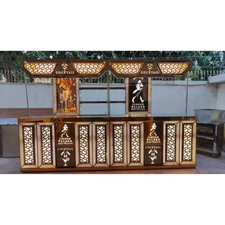 เคาน์เตอร์บุฟเฟ่ต์จัดเลี้ยงงานแต่งงานสมัยใหม่ ทำจากสแตนเลสและไม้ พร้อมตกแต่งด้วยการขัดเงาอย่างสวยงาม