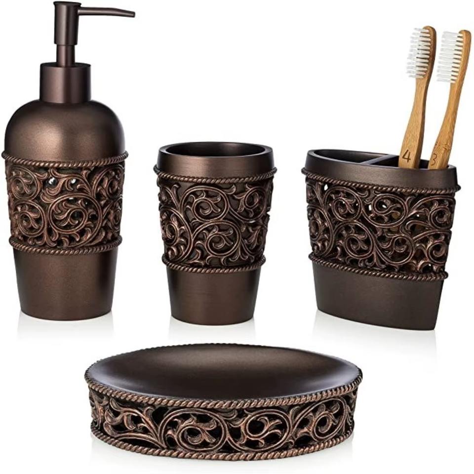 ชุดอุปกรณ์ห้องน้ำสีบรอนซ์สไตล์โมเดิร์นนิสต์ 4 ชิ้น ประกอบด้วย ที่จ่ายสบู่ แก้วน้ำ ที่วางแปรงสีฟัน และที่วางสบู่