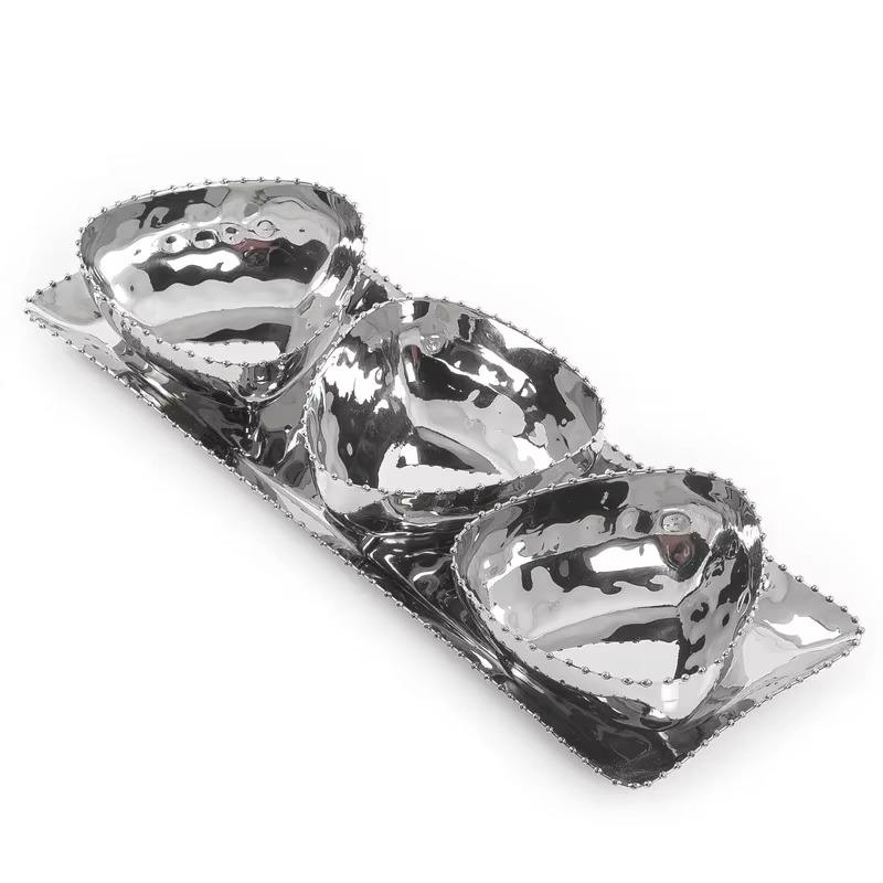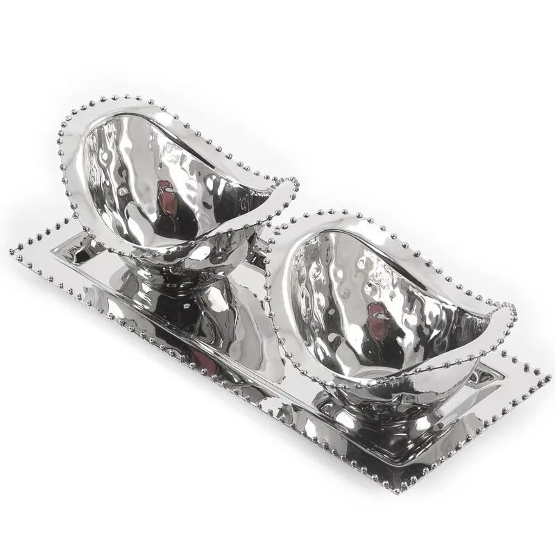 Modernist stainless steel candy bowl with matching tray works equally well for candies, chocolates, nuts, mints, or small snacks