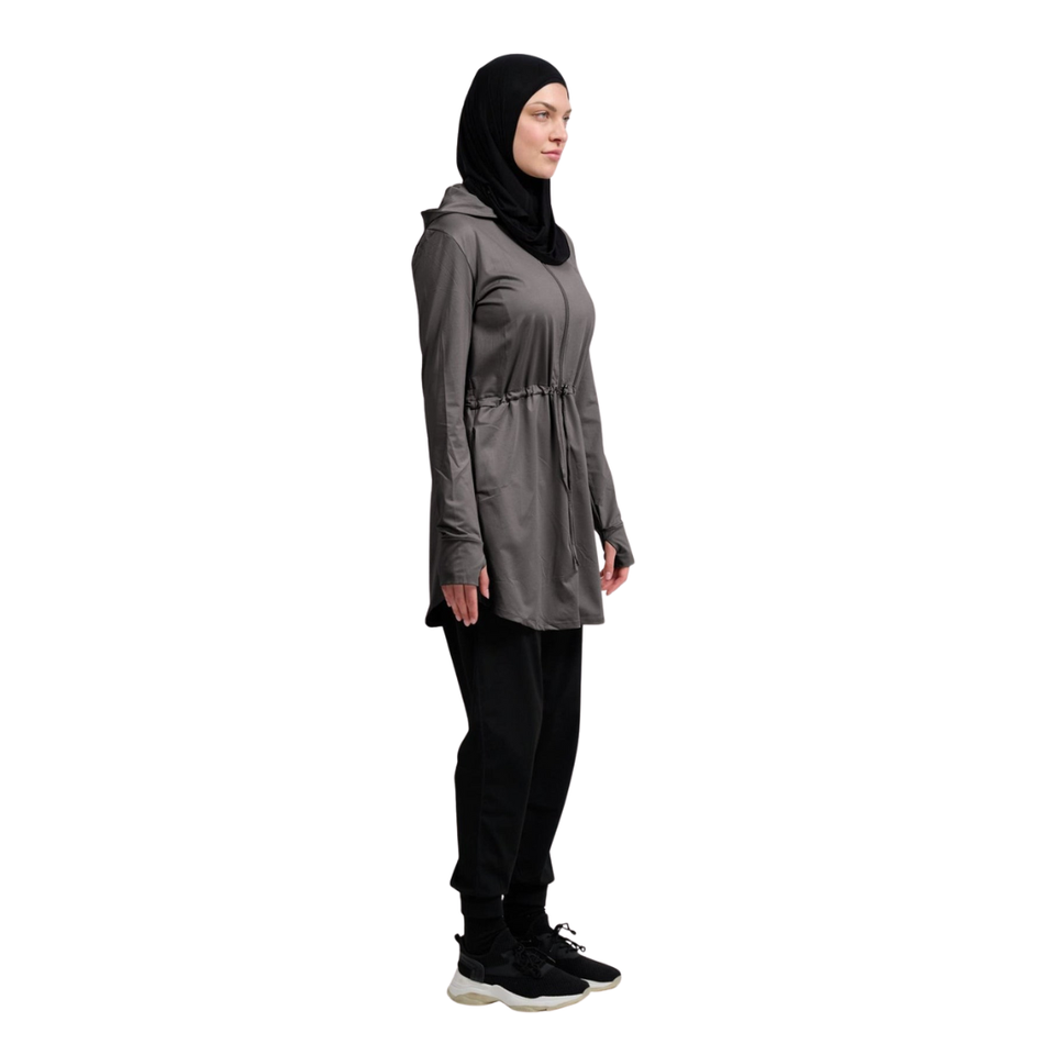 ผู้ผลิตชุดออกกำลังกายแบบเรียบง่ายสำหรับสตรีมุสลิม เสื้อผ้าออกกำลังกายแบบมีฮู้ด ผ้าโพลีเอสเตอร์สีพื้น ชุดกีฬาสำหรับออกกำลังกาย