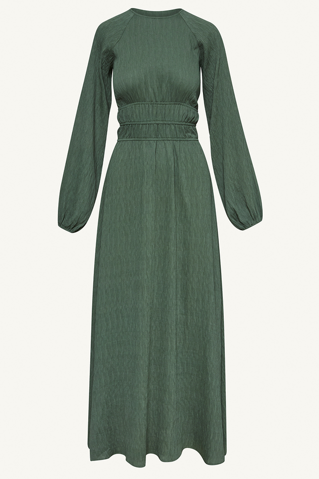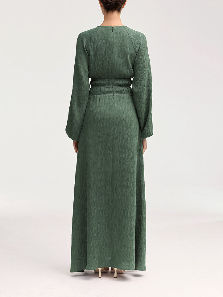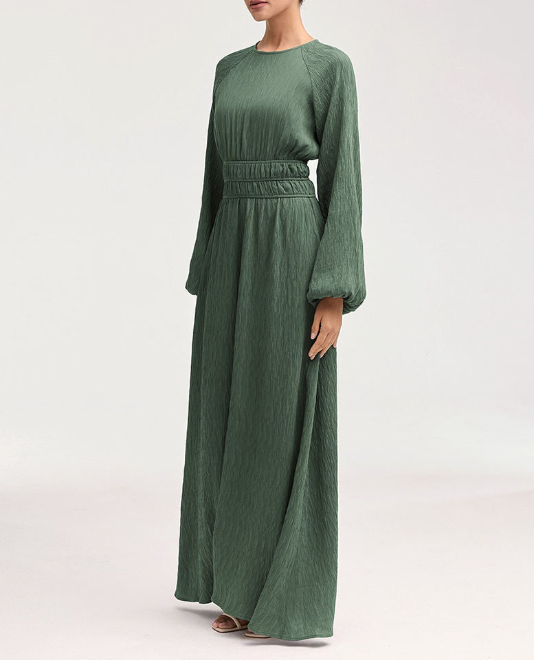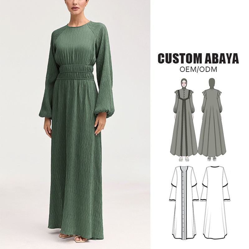 ชุดเดรสยาวเอวสูงของผู้หญิงมุสลิมสไตล์เรียบง่ายชุดเดรสแขนโคมไฟชุดยาวผ้าชีฟองลายนูนเอวธรรมชาติแฟชั่นเรียบง่าย