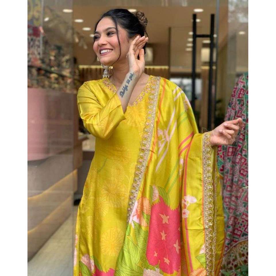 ผ้าเครปสีเหลืองปักลำดับเสื้อและล่างสไตล์เรียบง่ายแฟชั่นทันสมัย