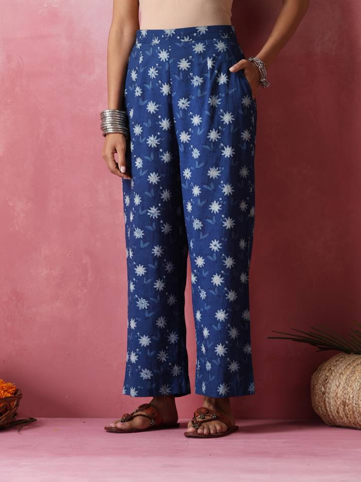 ชุดเสื้อคลุมและกางเกงของอินเดียพิมพ์ลายดอกไม้สีครามน่ารักเรียบง่ายชุด Kurta ยาวถึงพื้นผลิตจากพิมพ์ลายดอกไม้สวยงาม