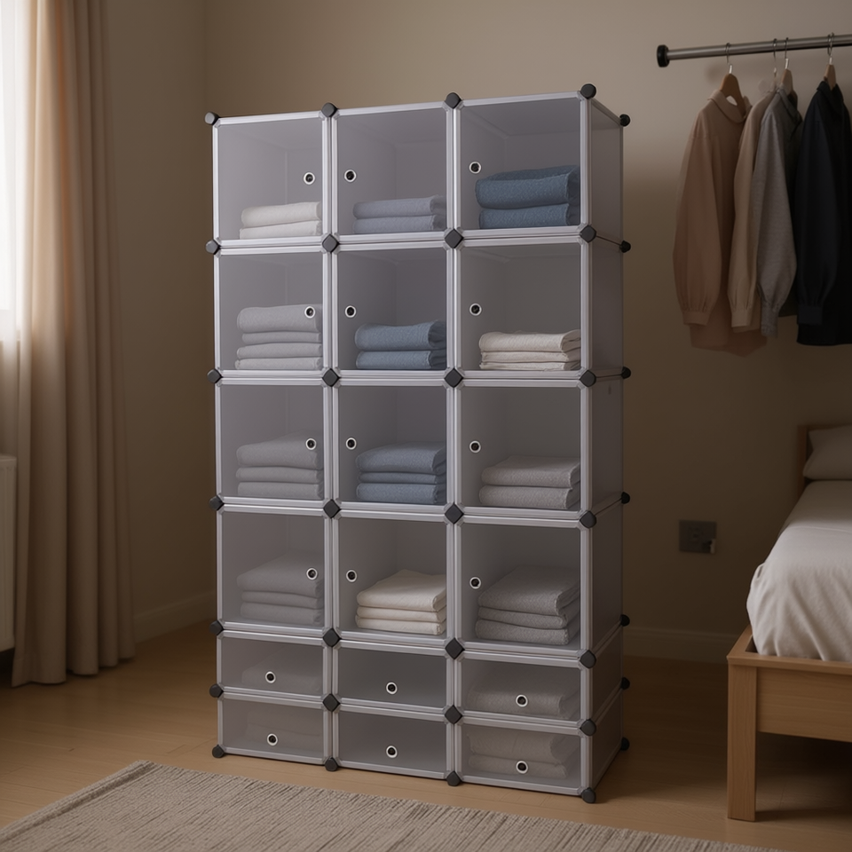 ตู้เก็บของแบบโมดูลาร์ 18 ช่อง ประกอบเองได้ พร้อมราวแขวนผ้า สำหรับจัดระเบียบบ้าน