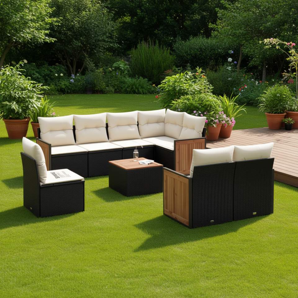 ชุดโซฟาสวนแบบโมดูลาร์หวาย PE สีดำ 9 ชิ้น เฟอร์นิเจอร์กลางแจ้งทันสมัย ทนทานต่อสภาพอากาศ พื้นที่ใช้สอยในสวน