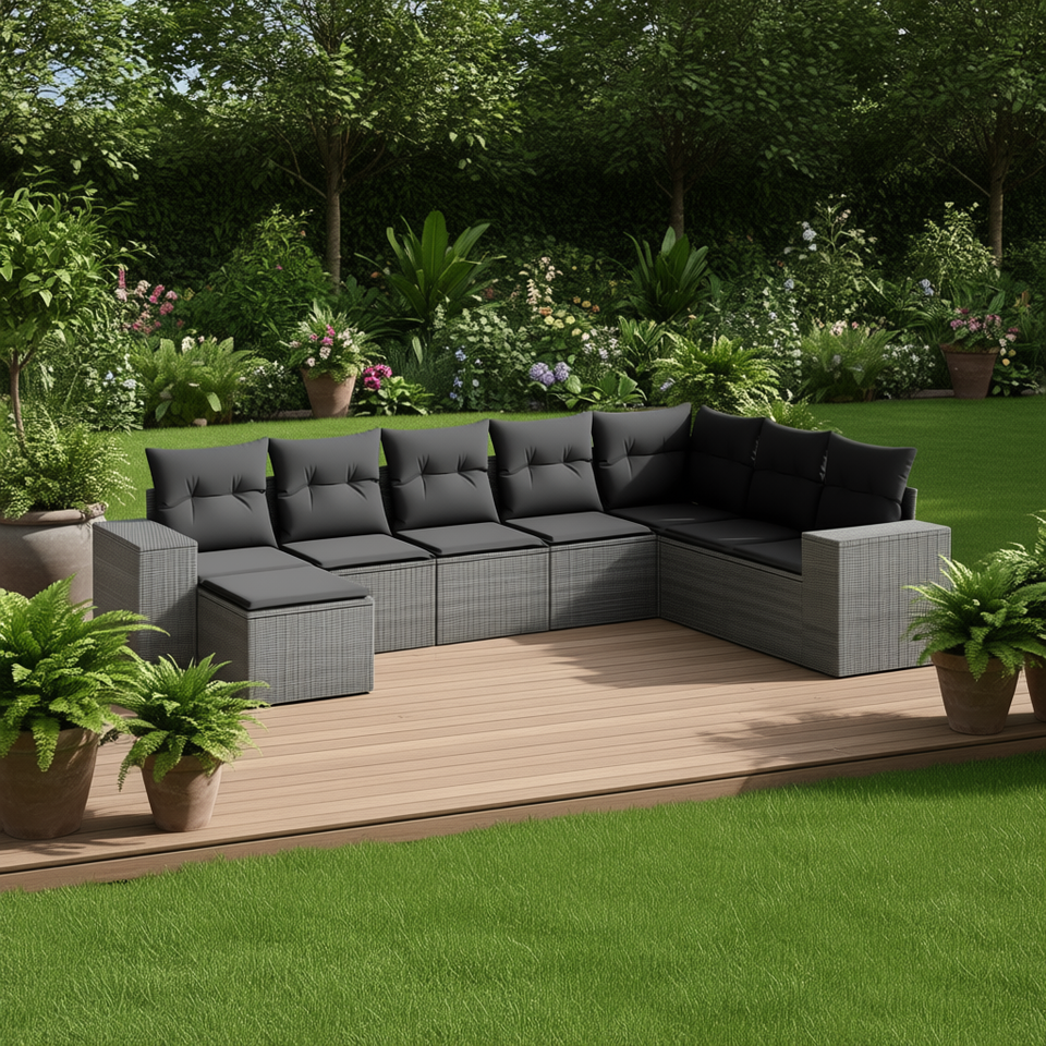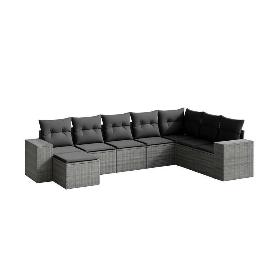 ชุดโซฟาสวนแบบโมดูลาร์ สีเทา โพลีราตัน โครงเหล็ก เฟอร์นิเจอร์กลางแจ้ง ดีไซน์ร่วมสมัย 6 ที่นั่ง