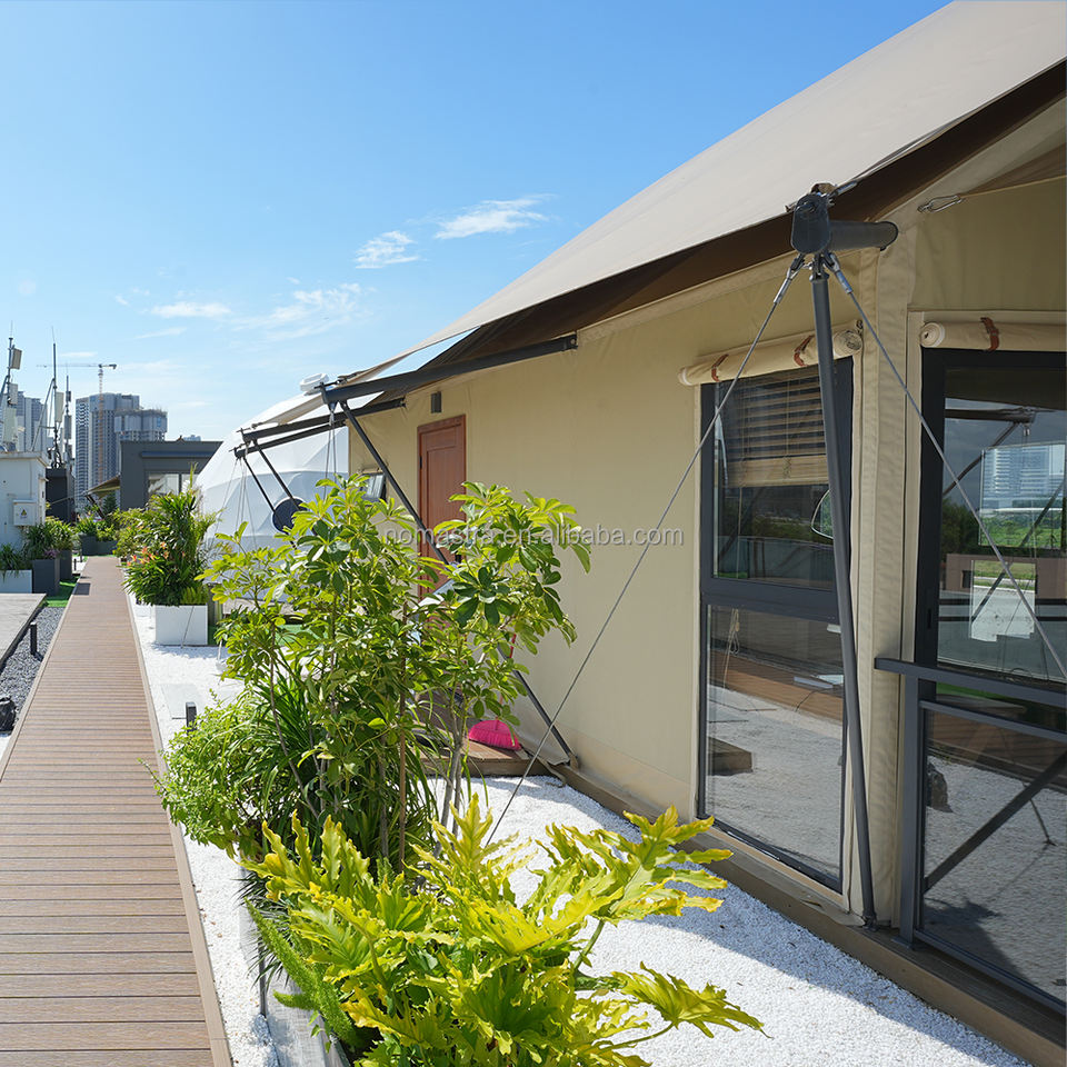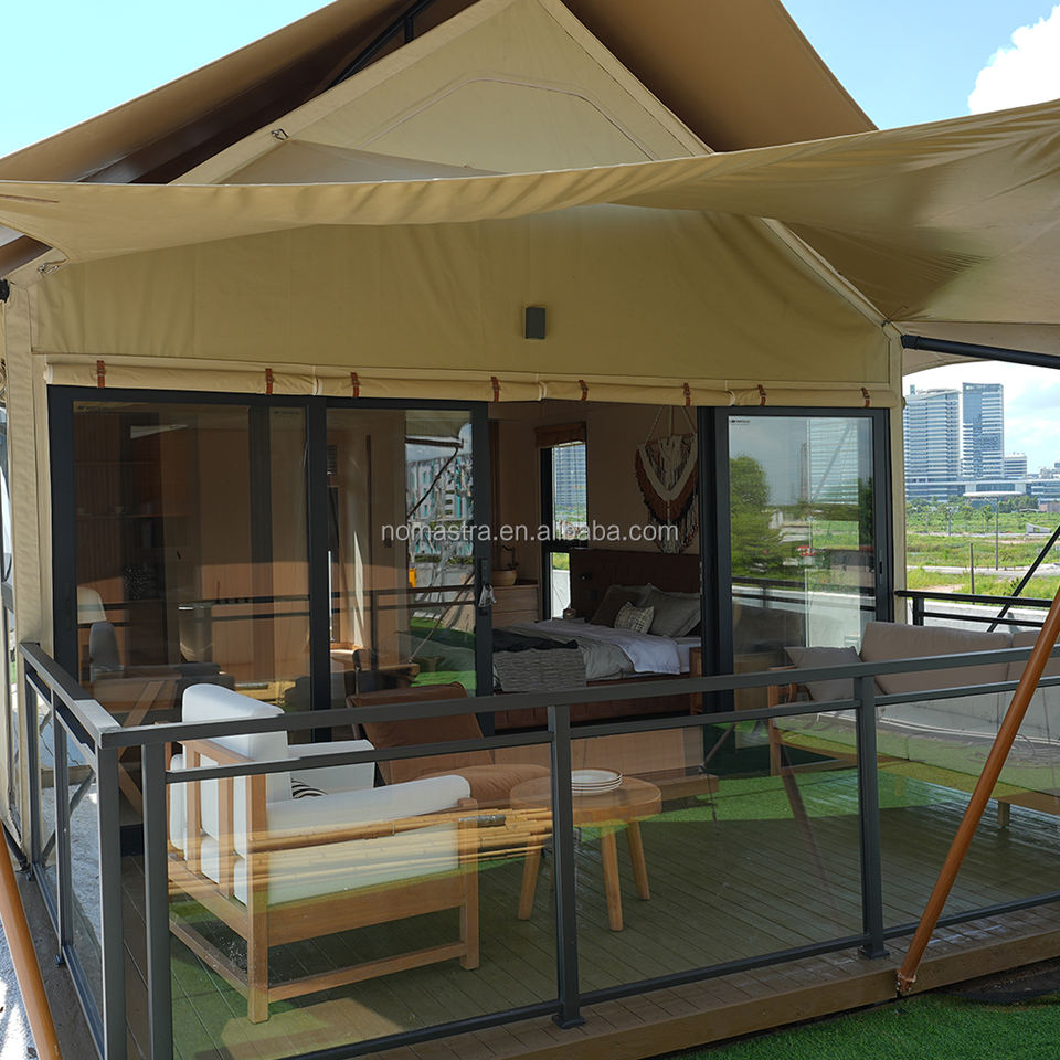 เต็นท์โรงแรมทำจากเหล็กแบบโมดูลาร์พร้อมปรับแต่งได้สำหรับห้องนอนห้องนั่งเล่นประตูทำจากไม้เนื้อแข็งเป็นมิตรกับสิ่งแวดล้อมเต็นท์วิลล่าสุดหรู