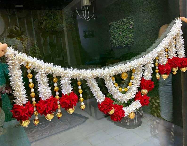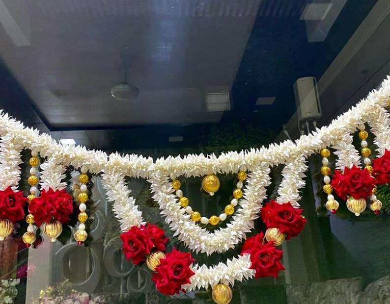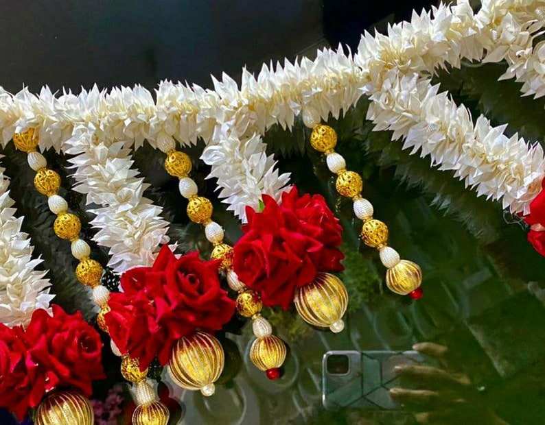 Mogra มาลัยพร้อมพวงมาลัยดอกกุหลาบแฮนด์เมดดอกไม้อินเดียแบบสายดอกไม้แบบอินเดียพวงมาลัยสำหรับงานแต่งงานอินเดีย OEM