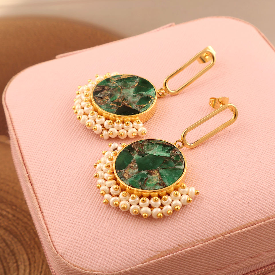 Mohมีต่างหูทองแดงเทอร์ควอยส์สีเขียวมรกตลวดห่อเล็กๆไข่มุกสวยงามออกแบบต่างหูสำหรับผู้หญิง