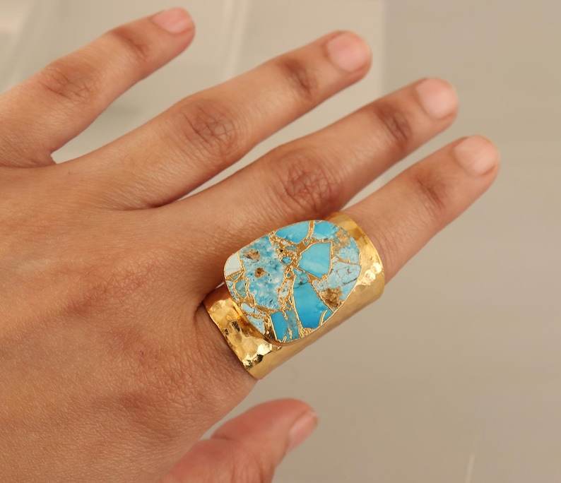 แหวนโมฮาเวเทอร์ควอยซ์เงินแท้ 925 ชุบทอง 14K ปรับขนาดได้ วงกว้าง ทำด้วยมือ เครื่องประดับพลอย