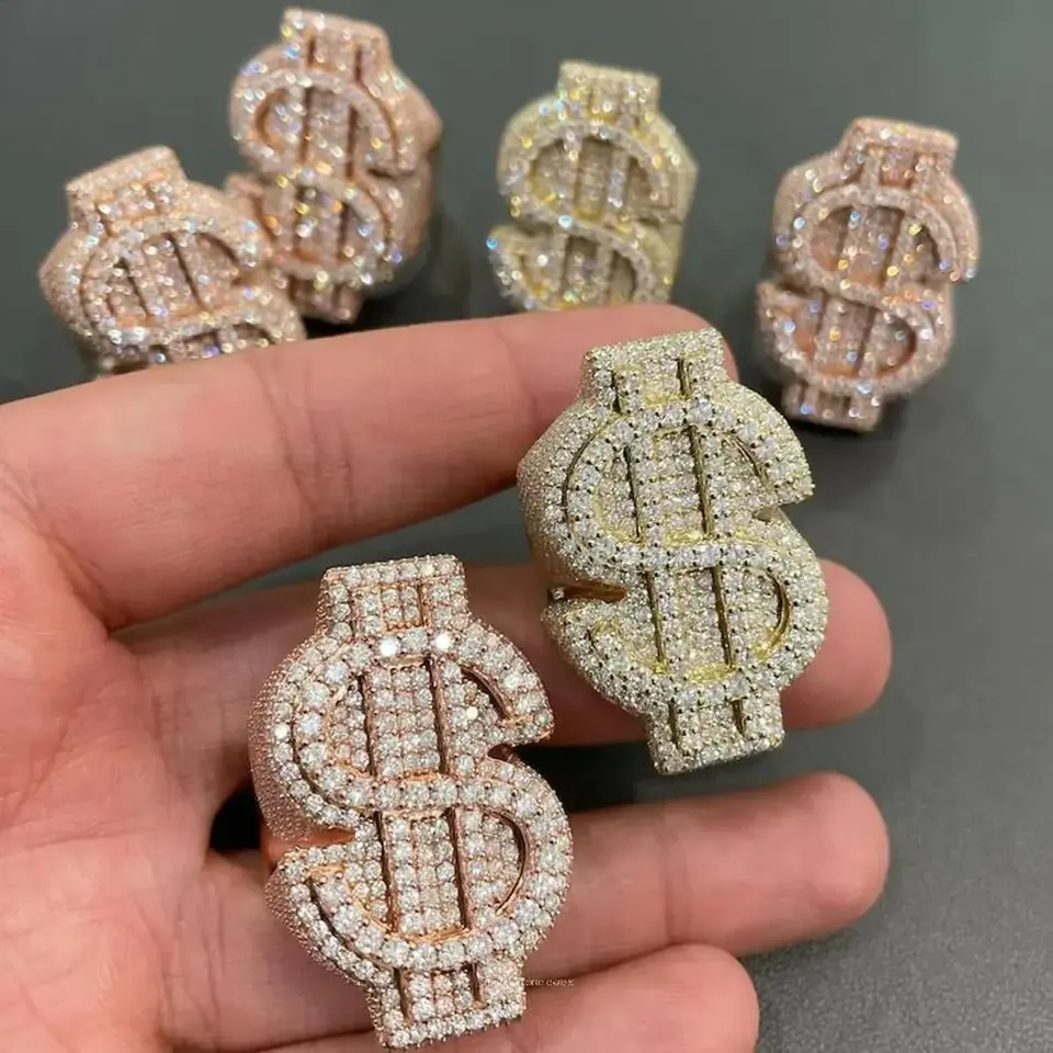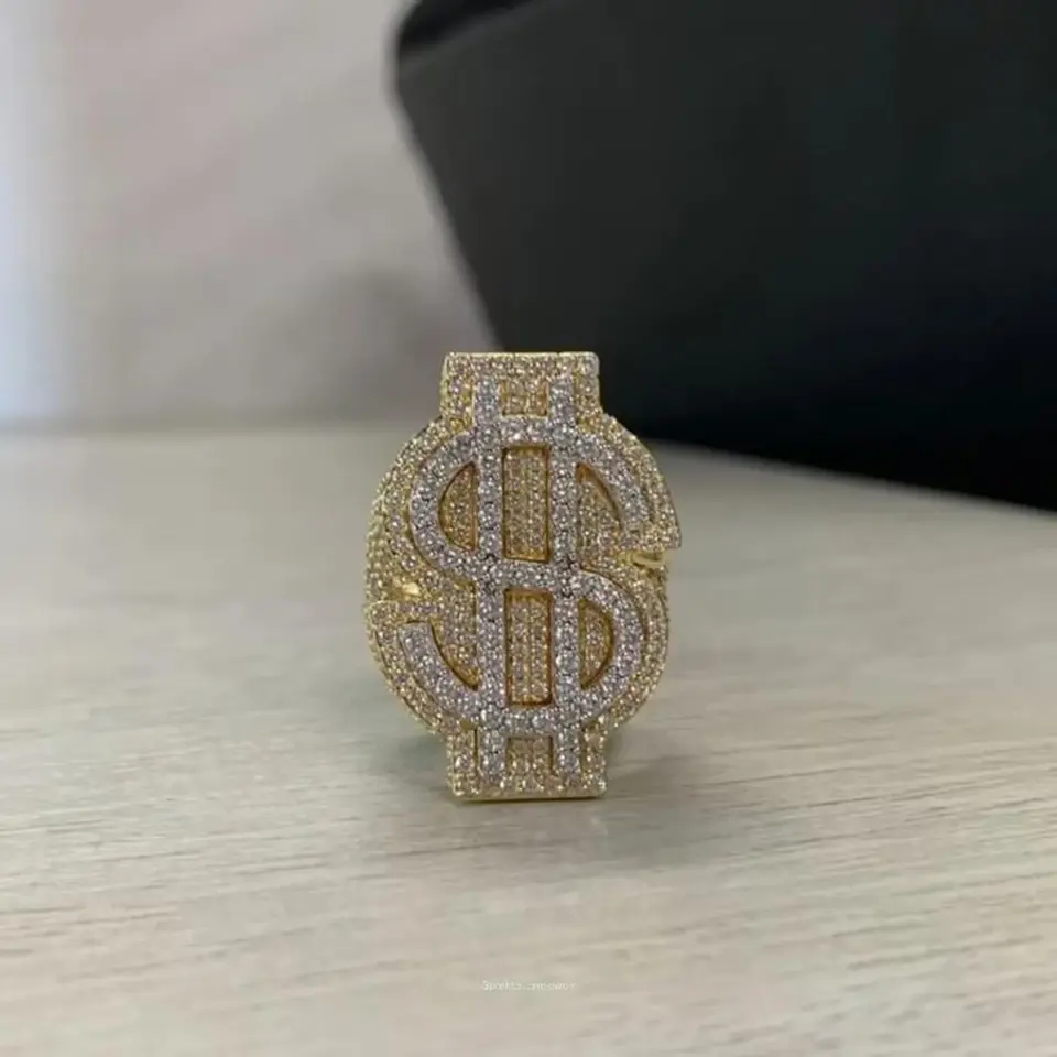 แหวนรูปสัญลักษณ์ดอลลาร์ประดับมอสซาไนต์ สำหรับทุกเพศ ทำจากเงินแท้ชุบทอง 4 กะรัต ปราศจากนิกเกิลและสารตะกั่ว ดีไซน์หรูหราสไตล์ฮิปฮอป
