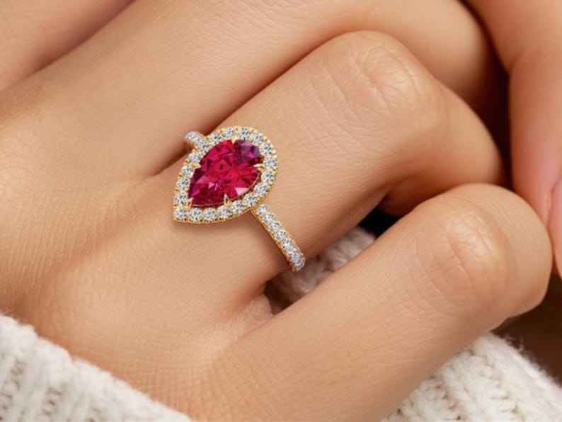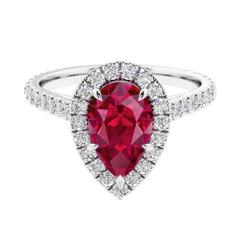 แหวนโมอิสไรต์ทรงลูกแพร์ ประดับรูบี้สีแดงแบบเฮโล