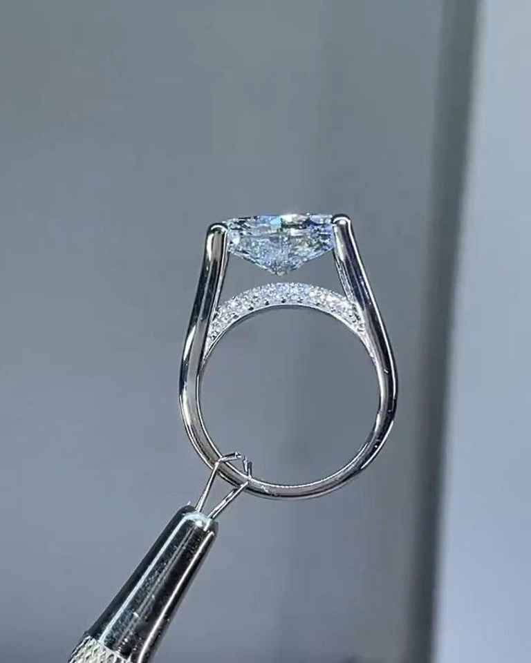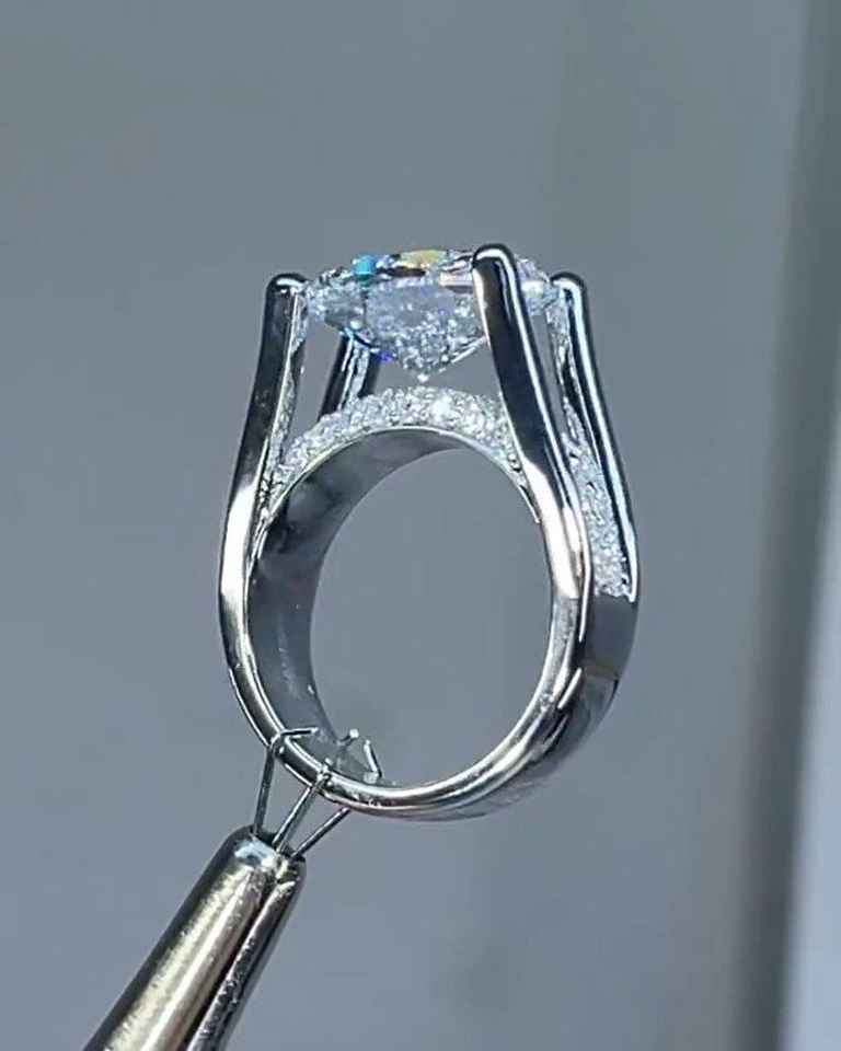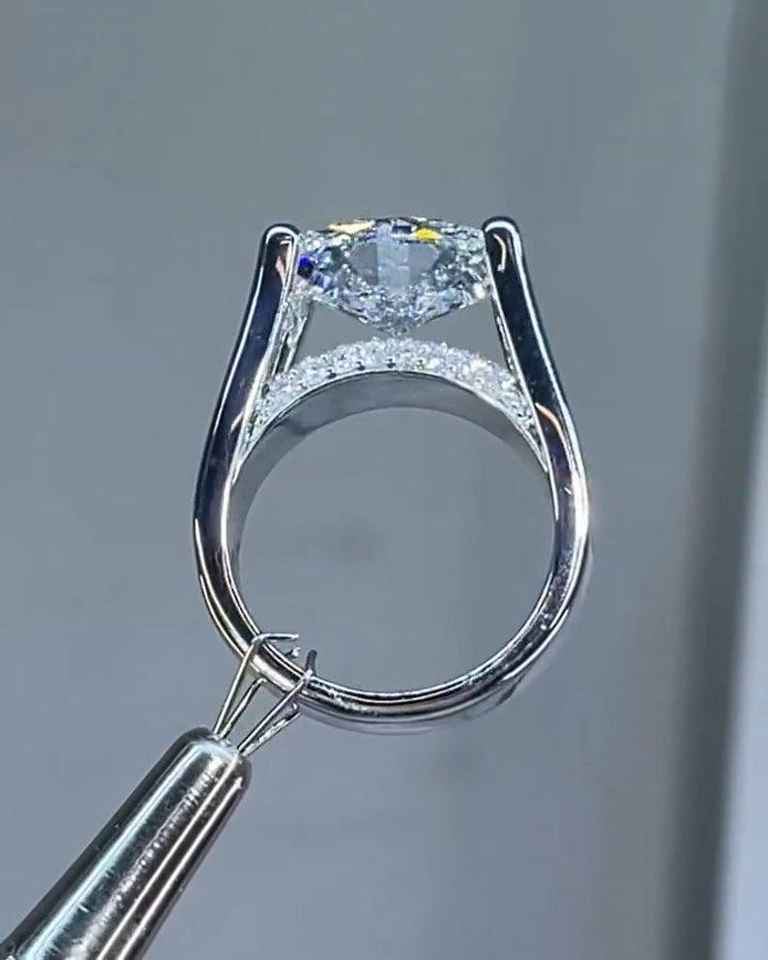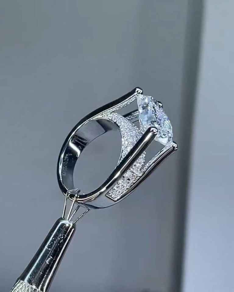 แหวนมอสซาไนต์ทรงรีประดับเพชรแบบพาเว่ ซ่อนรัศมีรอบเพชรเม็ดเดี่ยว ตัวเรือนเงินแท้ 925 ดีไซน์โดดเด่น เหมาะสำหรับเป็นแหวนแต่งงานหรือแหวนแทนใจสำหรับผู้หญิง