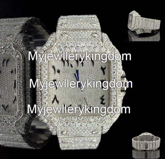 นาฬิกาข้อมือผู้ชายและผู้หญิง ประดับเพชรโมอิสซาไนต์และสแตนเลสสตีลเต็มหน้าปัด ตัวเลขแบบอารบิก กันน้ำได้ 10 บาร์