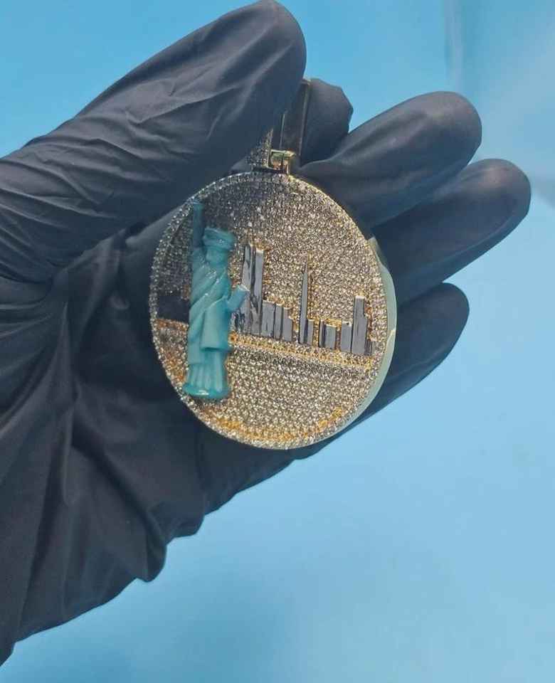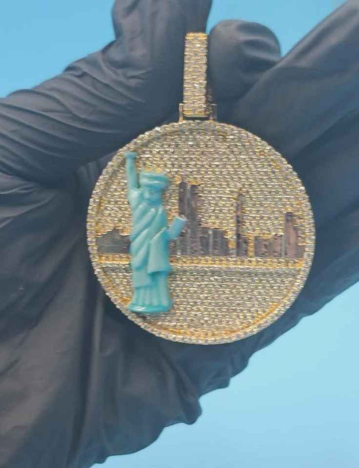 Design: จี้ห้อยคอรูปเทพีเสรีภาพพร้อมทิวทัศน์สกายไลน์นิวยอร์ก ประดับเพชร