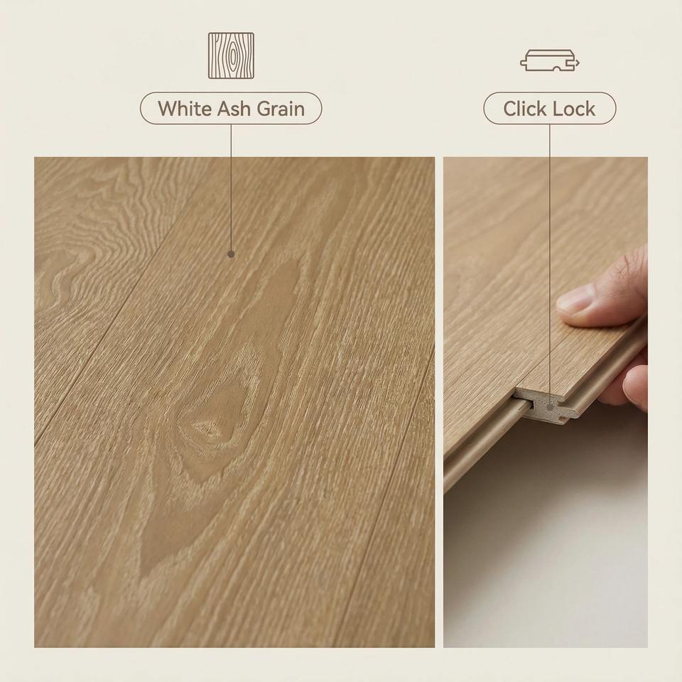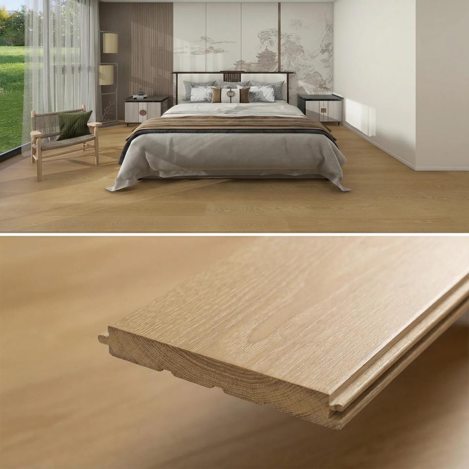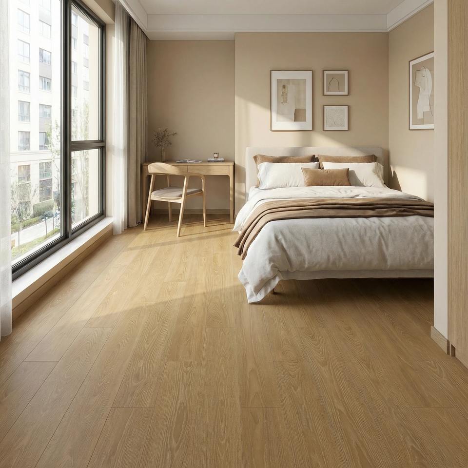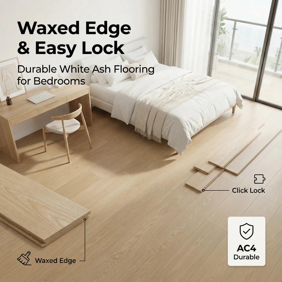 พื้นไม้แอชหลายชั้นเคลือบแว็กซ์กันความชื้น พร้อมมาตรฐาน AC4 และระบบคลิ๊กล็อค สำหรับห้องนอนในอพาร์ตเมนต์