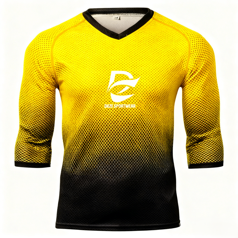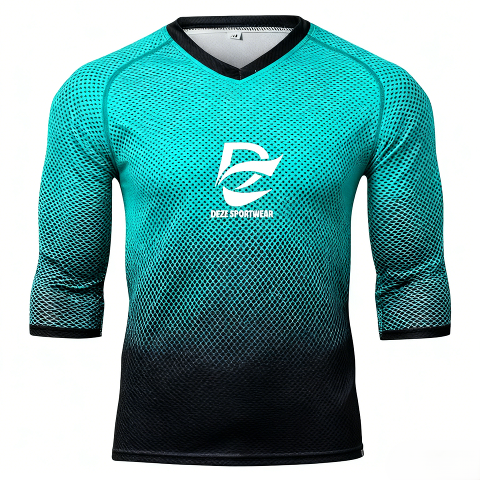 เสื้อยืดแขนสามส่วนสำหรับปั่นจักรยานแบบไล่เฉดสีสำหรับทีมชายหญิง ระบายความชื้น ทนทานต่อการสึกหรอ พิมพ์ลายได้ตามต้องการ เหมาะสำหรับการปั่นจักรยานลงเขาและเสื้อเจอร์ซีย์ MTB