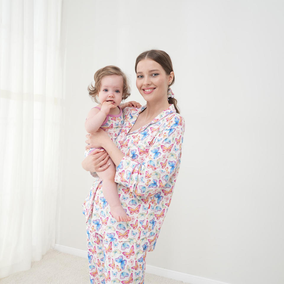 ชุดนอนครอบครัวสำหรับคุณแม่และลูกสาว ชุดนอนเด็กทารกแบบจั๊มสูทเอวยางยืด ลายดอกไม้ แขนสั้น ผ้าใยไผ่โมดอล