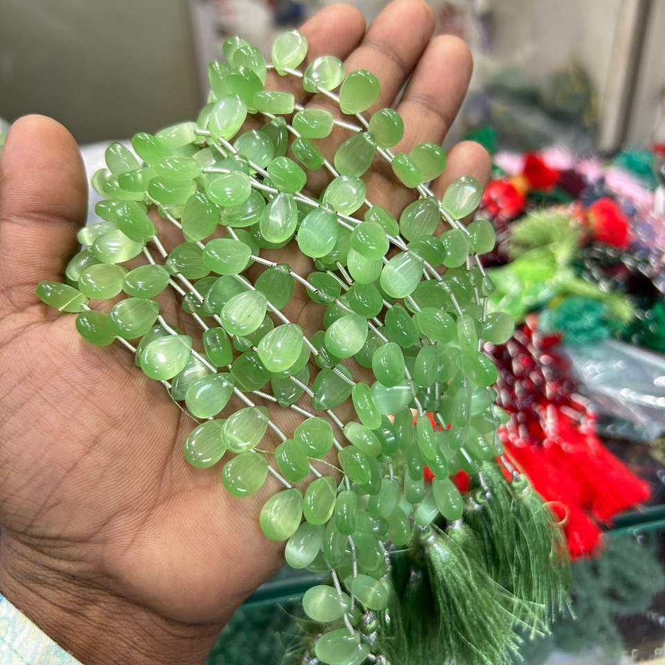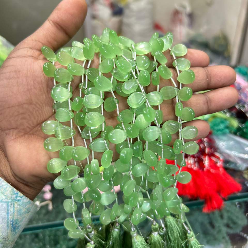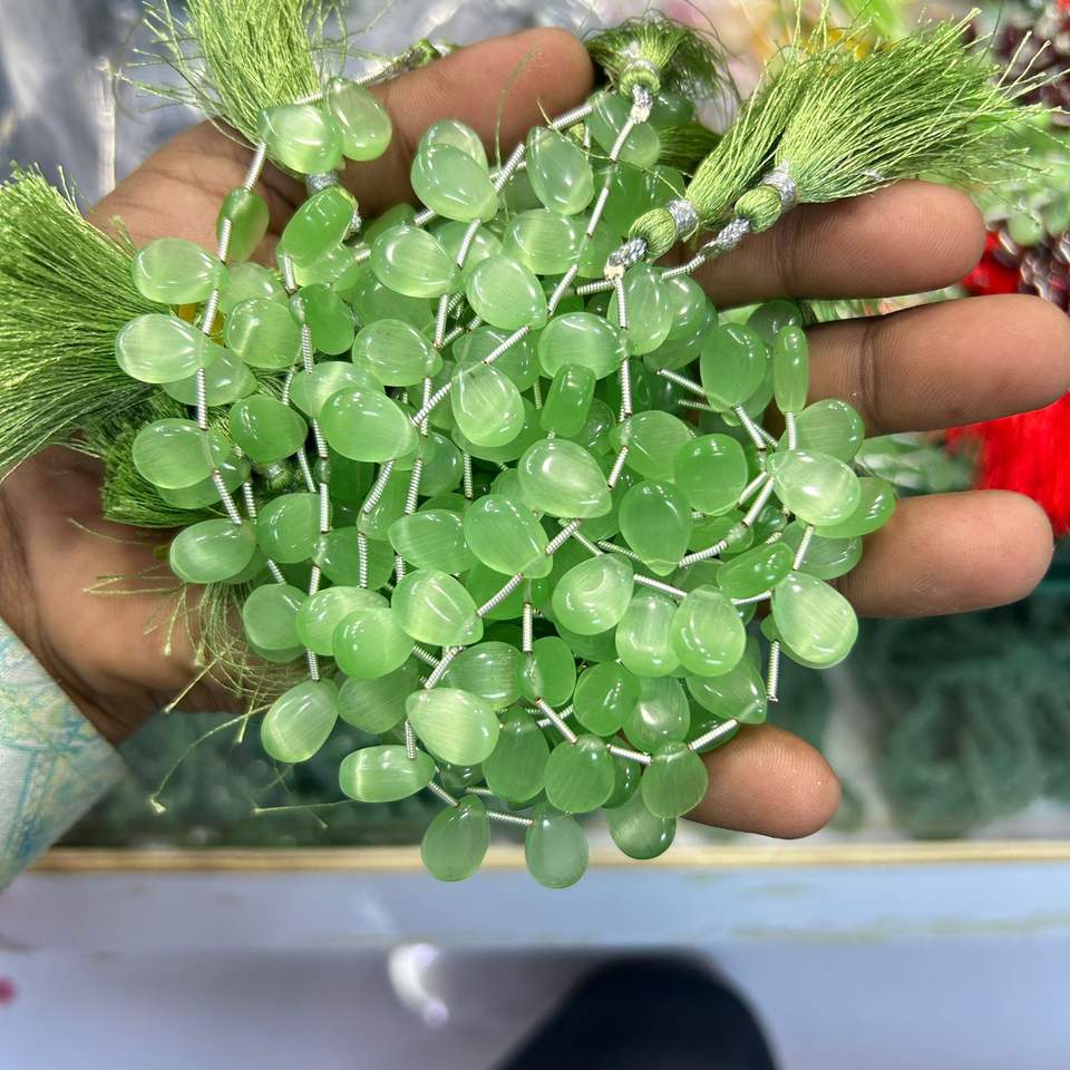 พลอยโมนาลิซ่าทรงรี/ทรงหยดน้ำ รูปทรงลูกปัด สีเขียวใยแก้วนำแสง พลอยทรงรีธรรมชาติ คุณภาพสูง รับรองโดยบุคคลที่สาม