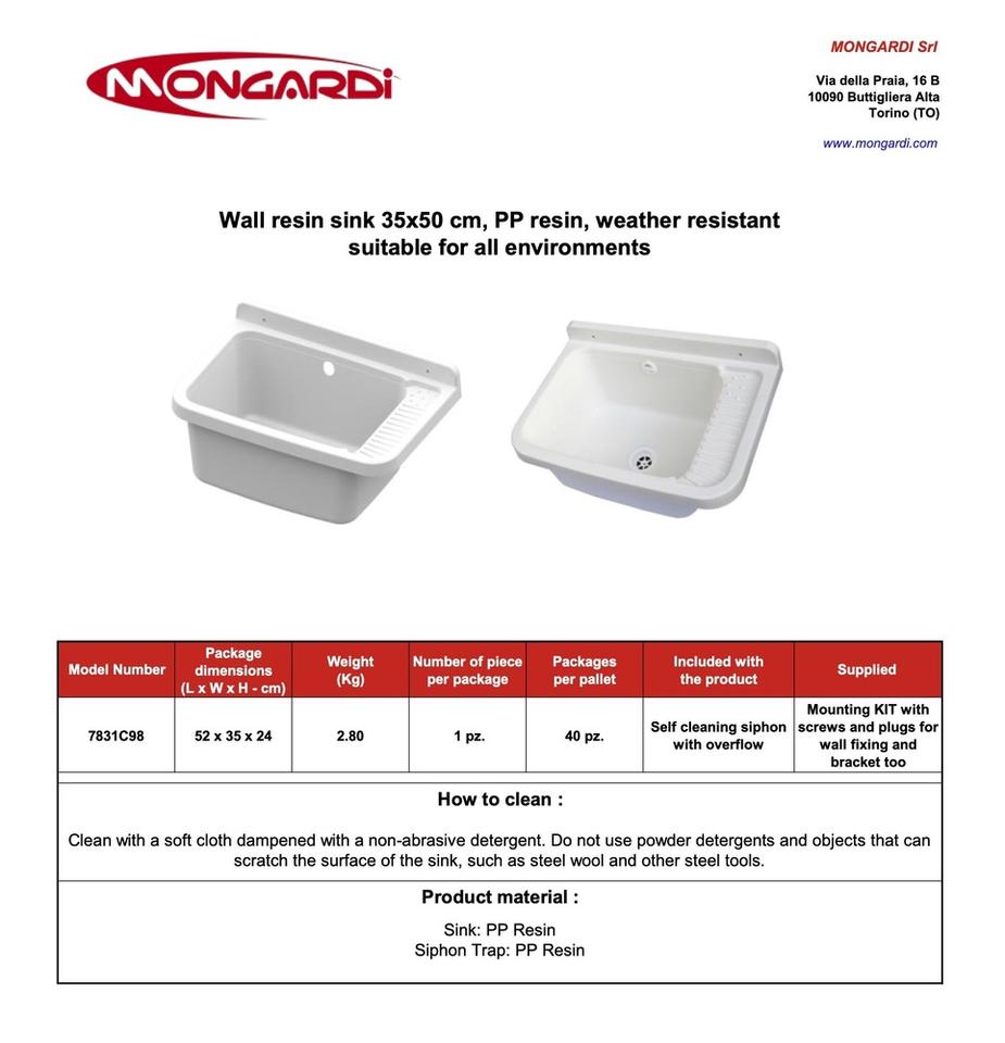 Mongardi อ่างล้างหน้าซีเมนต์สีเทาติดผนัง, L50 x W35 x H24ซม. วัสดุทำจากเรซิ่น PP ชุดยึดท่อระบายน้ำชุดยึดสำหรับบ้านสำนักงานจากอิตาลี