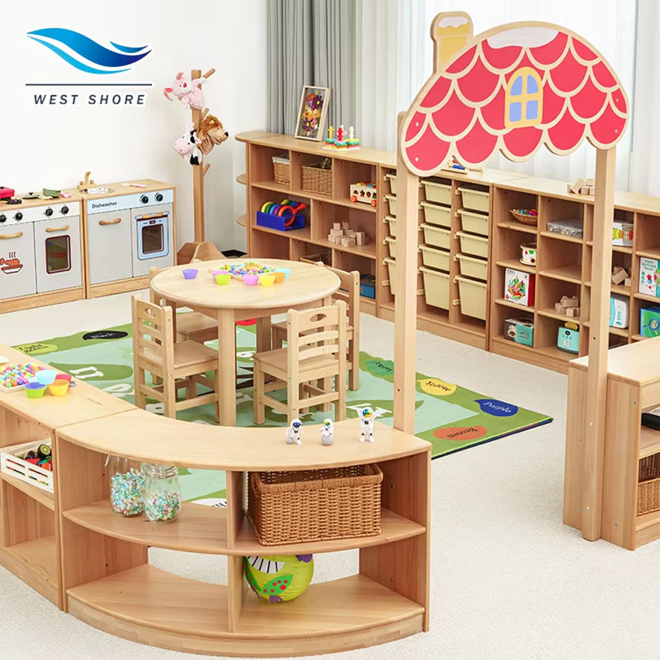 ตู้เก็บของไม้มอนเตสซอรี่แบบเปิดได้สำหรับเด็กก่อนวัยเรียน อนุบาล ศูนย์รับเลี้ยงเด็ก และเฟอร์นิเจอร์ห้องเรียน