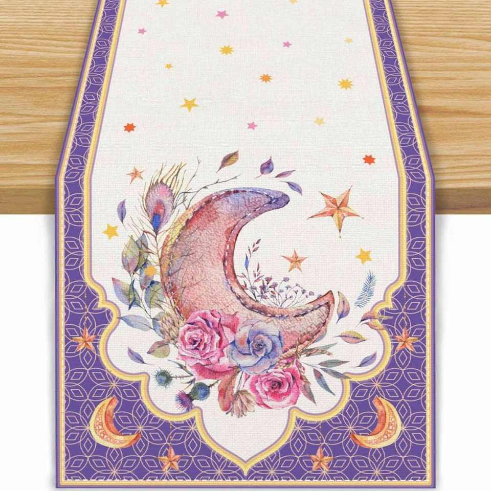 ผ้าปูโต๊ะลายดอกไม้พระจันทร์และดวงดาวสำหรับเทศกาลรอมฎอนและอีด ผ้าปูโต๊ะสำหรับครัวและห้องรับประทานอาหารในวันหยุด ผ้าปูโต๊ะรอมฎอน
