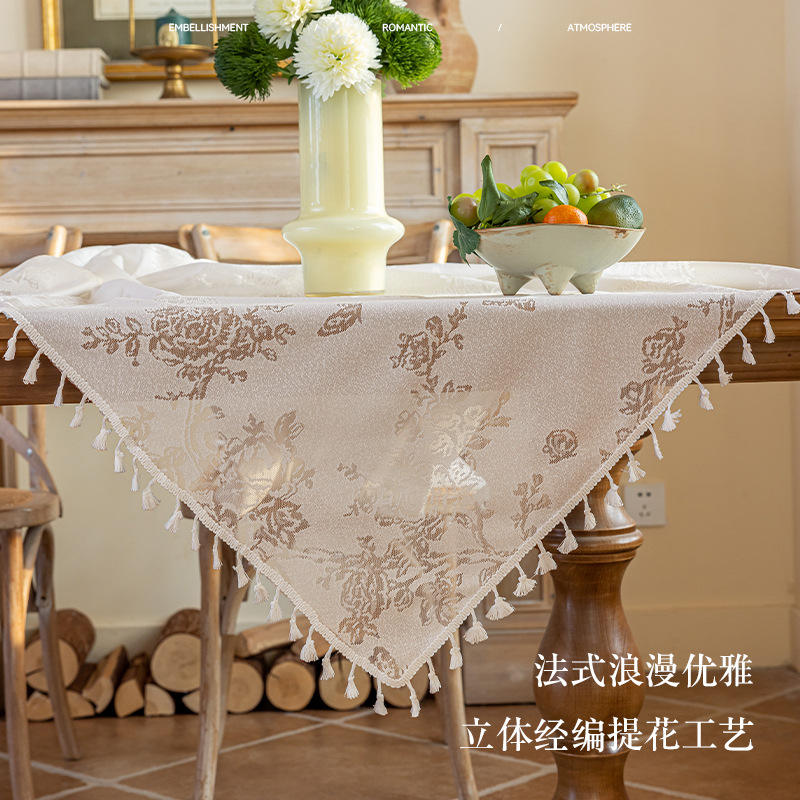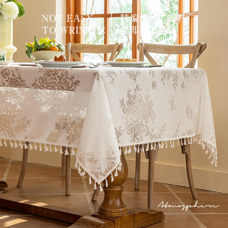 ผ้าปูโต๊ะลายดอกไม้ Moonbud Jacquard รูปทรงสี่เหลี่ยมผืนผ้า ผลิตจากโพลีเอสเตอร์ กันฝุ่น สำหรับใช้ในบ้าน พร้อมพู่ห้อยและลวดลายดอกไม้