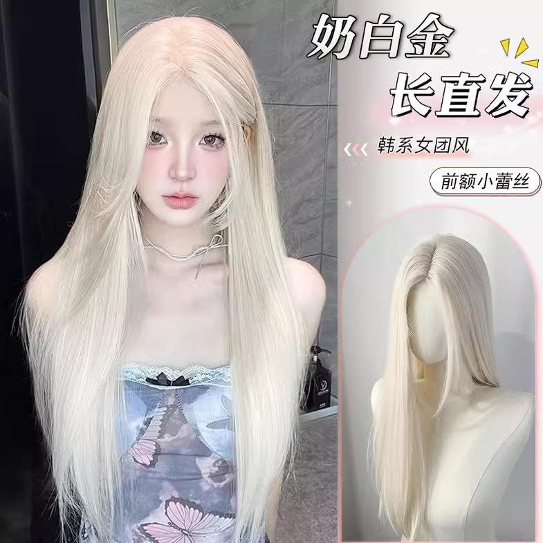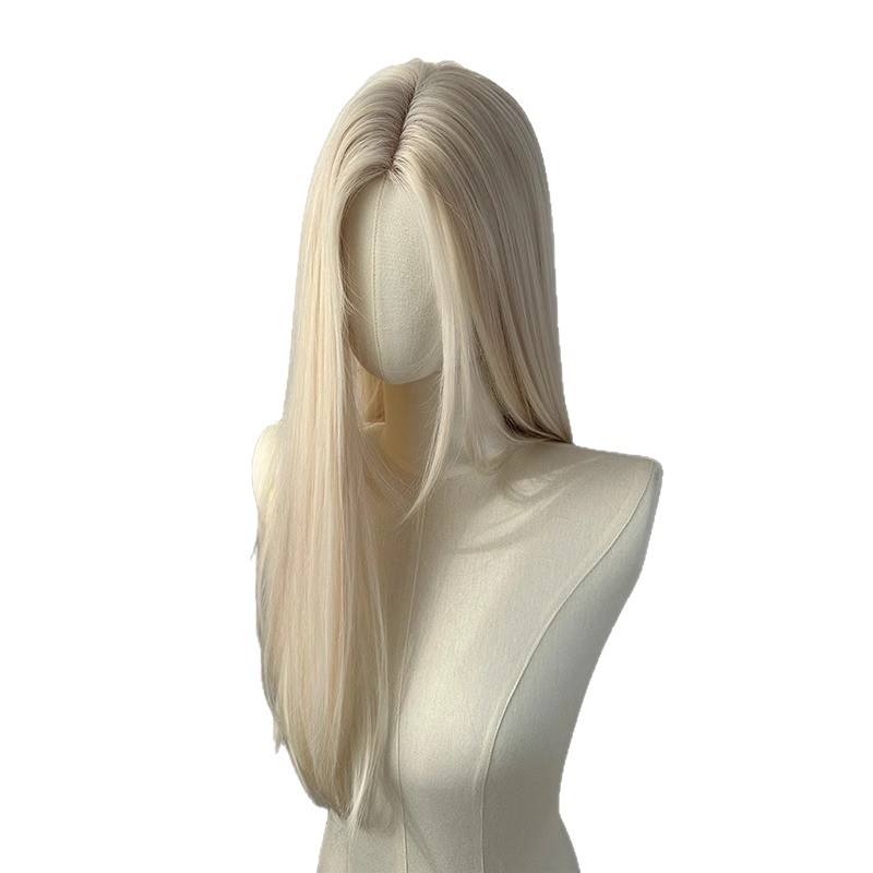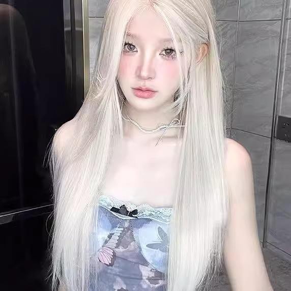 วิกผมยาวตรงสีขาวมูนไลท์ พร้อมหน้าม้าปัดข้าง เส้นผมธรรมชาติ ปิดคลุมทั้งศีรษะ เส้นใยสังเคราะห์คาเนคาลอน