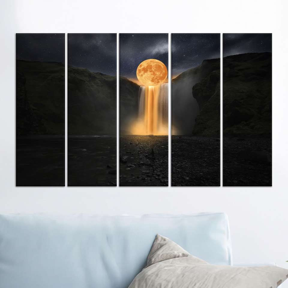 ภาพพิมพ์บนผืนผ้าใบ น้ำตกใต้แสงจันทร์: ศิลปะตกแต่งผนังแนวแฟนตาซี ชุดผ้าใบ 5 ชิ้น