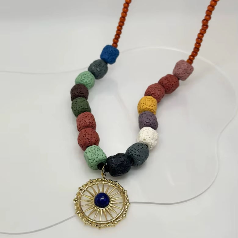 Moonriver สร้อยคอลูกปัดหินภูเขาไฟหลากสีทำด้วยมือสไตล์แอซเท็กสแตนเลสชุบทองของขวัญที่ไม่ซ้ำกัน