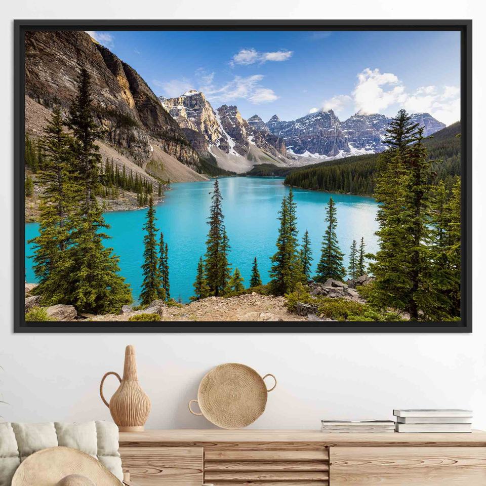 ภาพพิมพ์บนผ้าใบทะเลสาบโมเรน: ภาพศิลปะติดผนังทิวทัศน์แบนฟ์ อัลเบอร์ตา, ผ้าใบติดกรอบสีดำ