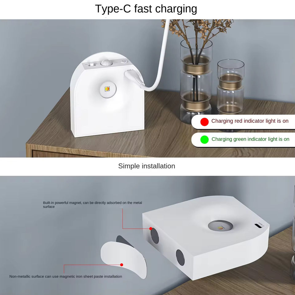 โคมไฟติดผนังในบ้านแบบสมาร์ททันสมัย ชาร์จไฟผ่าน USB พร้อมเซ็นเซอร์ตรวจจับความเคลื่อนไหวแบบไร้สาย แม่เหล็กยึดติดได้ ใช้ได้กับบันได ข้างเตียง ไฟกลางคืน LED สไตล์นอร์ดิก