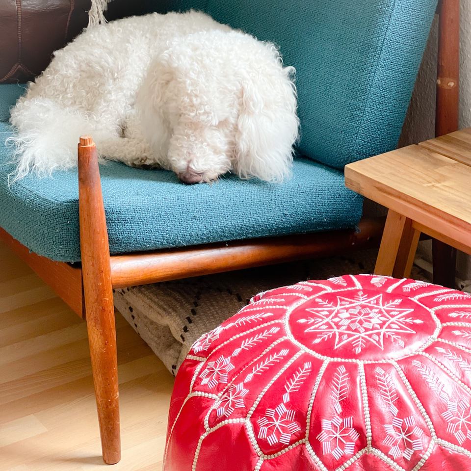 หนังแท้สไตล์โมร็อกโกสีแดง pouf ottoman เก้าอี้หนังทรงกลมเย็บด้วยมือเก้าอี้วางเท้าของตกแต่งบ้าน
