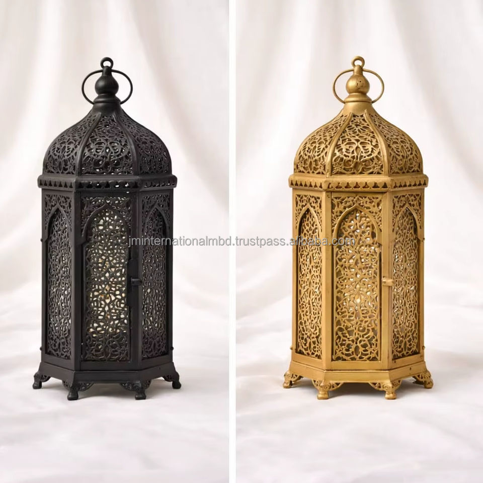 ตะเกียงโลหะสีทองแบบโมร็อกโกสำหรับตกแต่งบ้าน ทำด้วยมือ ใช้ได้ทั้งบนโต๊ะและพื้น