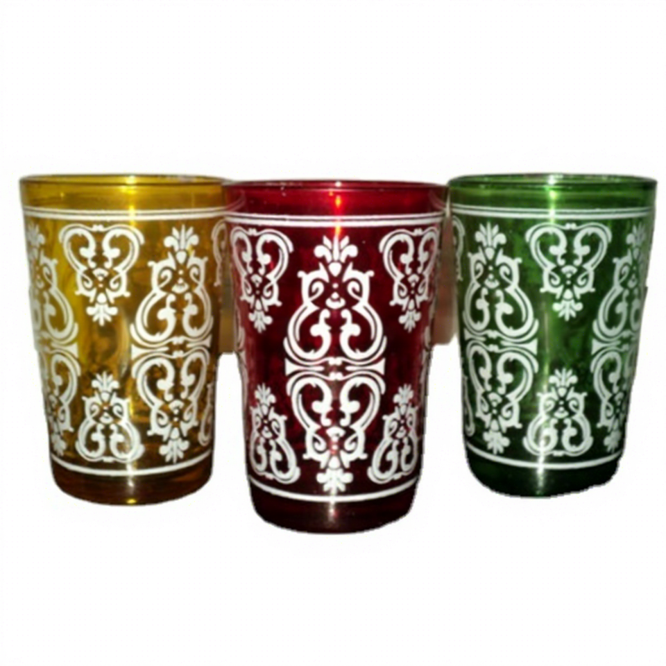 ชุดแก้วน้ำชาโมร็อกโก 6 ใบ แก้วช็อตสีทอง สไตล์เมดิเตอร์เรเนียน ลายพิมพ์สีสันสดใส ผลิตในอินเดีย