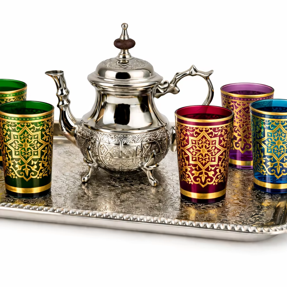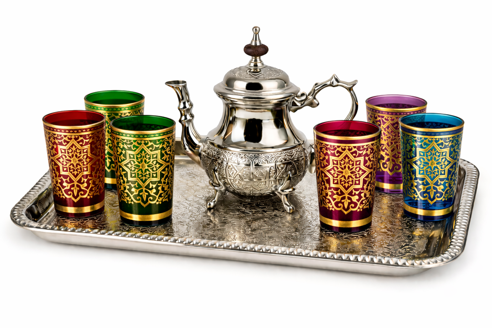 ถาดโมร็อกโก กาน้ำชา และแก้วหลากสีในชุดของขวัญ