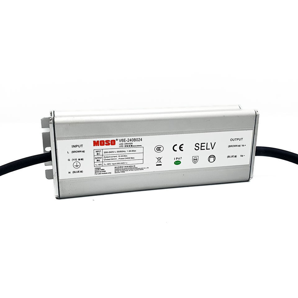 ไดรเวอร์ LED รุ่น Moso V6E-240B024 กำลังไฟ 240 วัตต์ แรงดันคงที่ 24 โวลต์ 10 แอมป์ กันน้ำระดับ IP67 สำหรับไฟ LED Strip