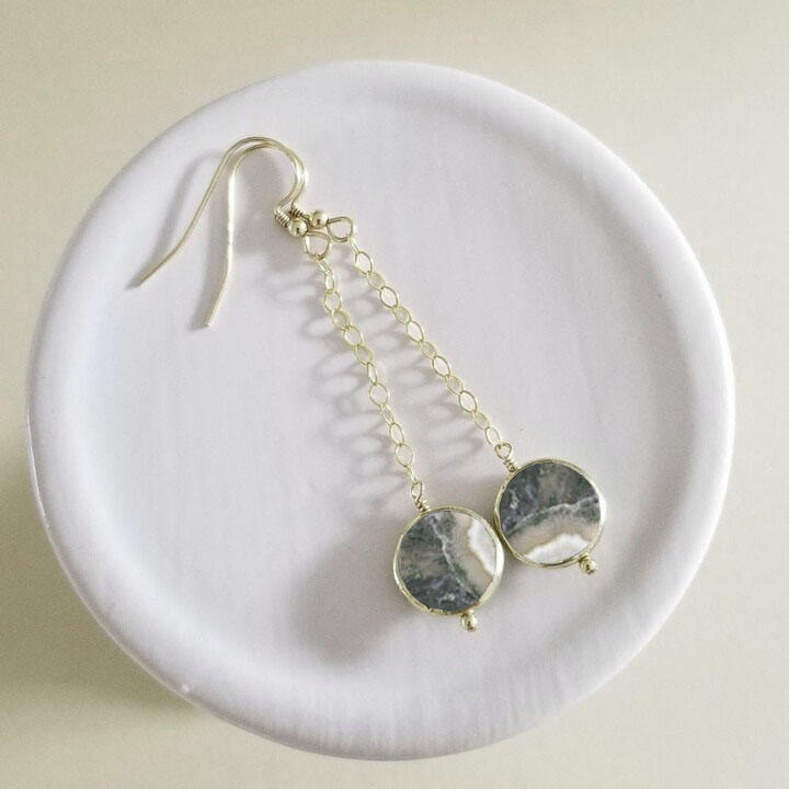 ต่างหูห้อยรูปเหรียญมอสอาเกตสีเขียวอัญมณีธรรมชาติชุบเงินเครื่องประดับทำมือสำหรับผู้หญิง