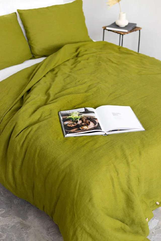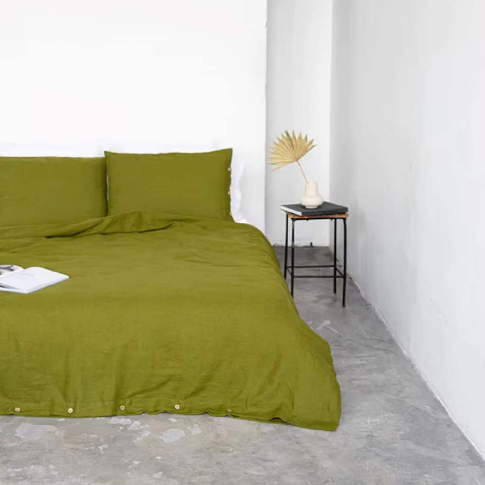 ชุดผ้าห่มคอตตอนสีเขียวมอส 300 เส้นด้าย พร้อมปลอกหมอน 2 ใบ ผ้าห่มนุ่มแบบซักแล้ว สำหรับโรงแรมและตกแต่งห้องนอนที่บ้าน