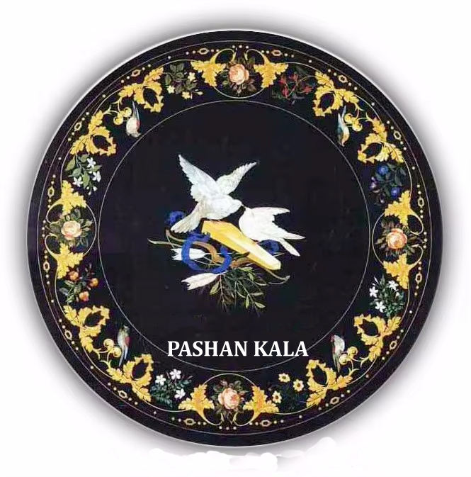 โต๊ะกาแฟรูปทรงกลมสีดำฝังลายนกและดอกไม้รูปทรงกลมใช้สำหรับตกแต่งบ้าน