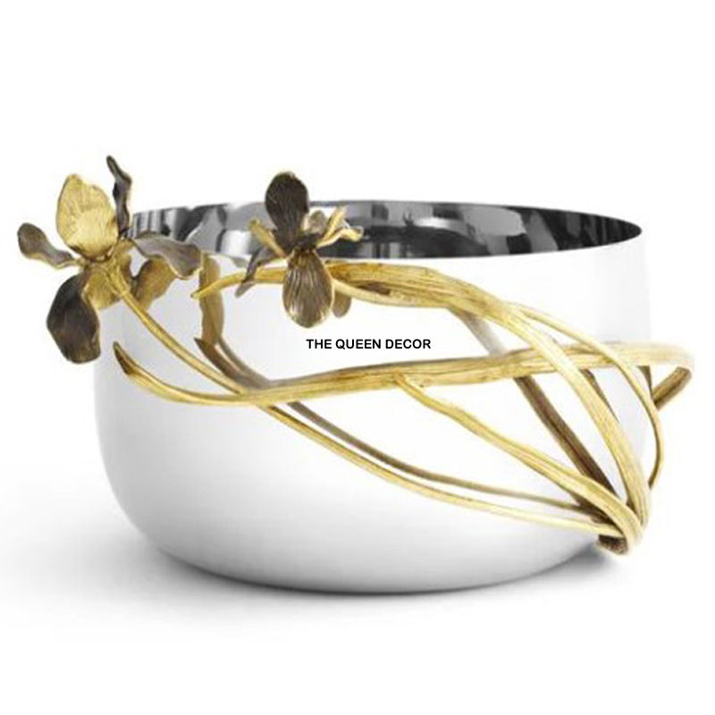 Most Demanded Attractive Look Set of 2 White Enamel Finished Round Shape Bowls Gold Plated Flowers Designer Frame