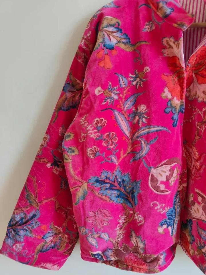 Pink Floral Print Embroidered Reversible Eco-Friendly 100% Cotton Velvet Bomber Jacket Short Length Breathable Winter Fashion