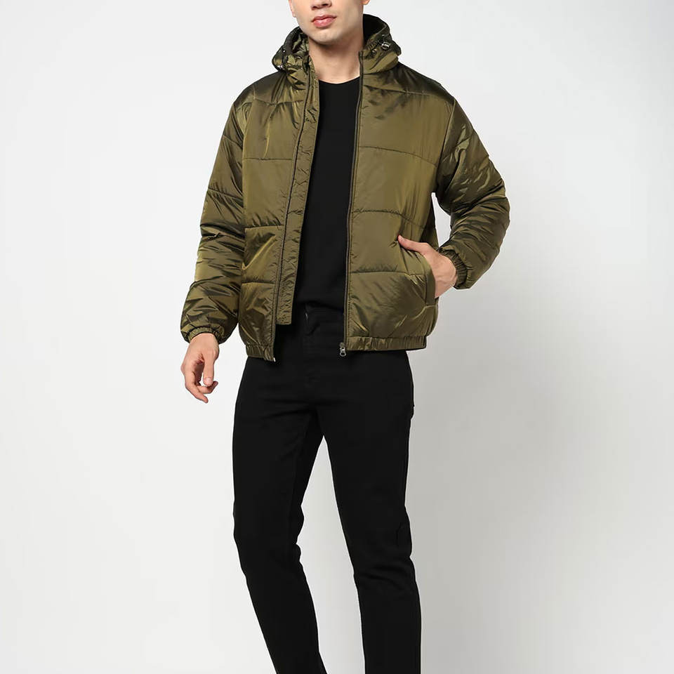 Most Demanding Lightweight Eco Friendly Hooded Men Puffer Jacket Best Quality Street Wear Front Logo