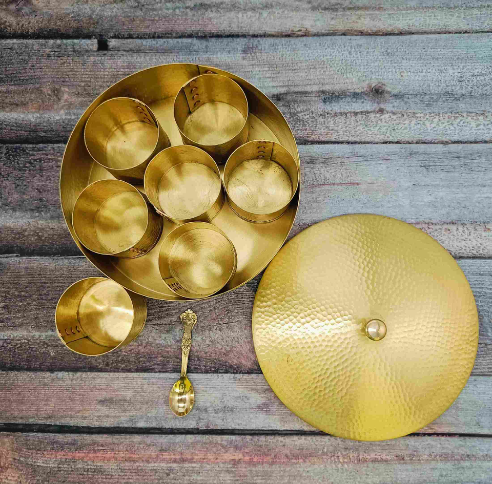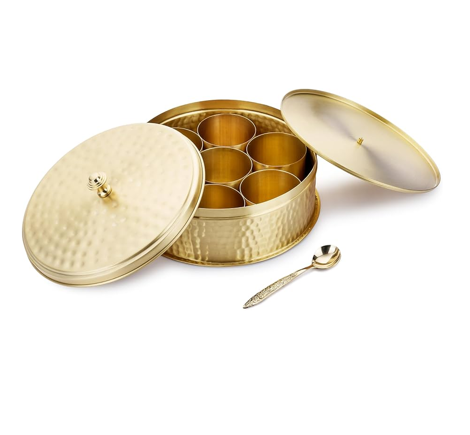 กล่องเครื่องเทศโลหะเจ็ดช่องกล่องมาซาลาทองเหลืองทำด้วยมือมีฝาปิดนูน