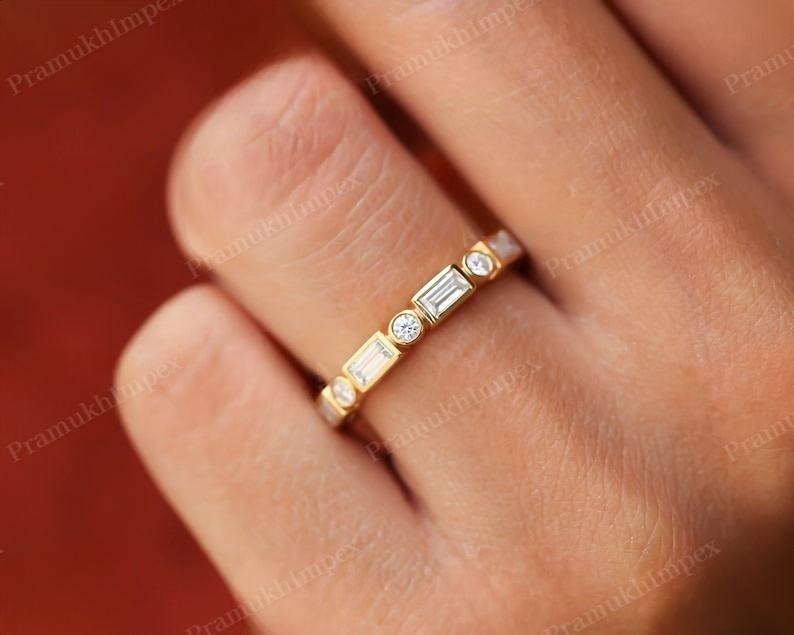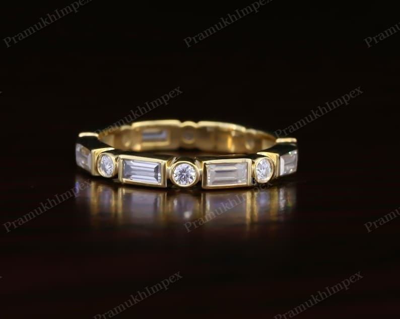 แหวนแต่งงานเพชรแล็บโกรนทรงบาแกตต์และทรงกลมแบบฝังขอบยอดนิยม แหวนทองคำ 14K สีเหลืองทอง สำหรับวันครบรอบแต่งงาน